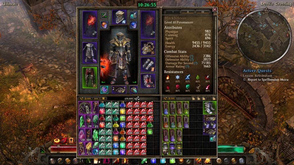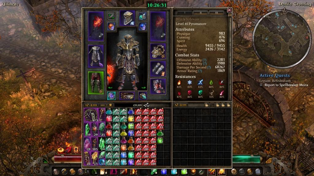This character don’t have real problems. No difficulty at all against Moosilauke (hoarfrost ointment is your friend), Valdaran, Bennjahr, Fabius ; even with a crowd of mobs around you. Farm Port Valbury and Aldritch is a real and safe pleasure with this pyromancer. SoT and BoC are easily farmed. Because of his fire resists, Shar’Zul is a little longer to kill but not particularly difficult. Madqueen ? She doesn’t give any problem and is not long to kill, just have a good use of the Blastshield and Divine Light proc times.