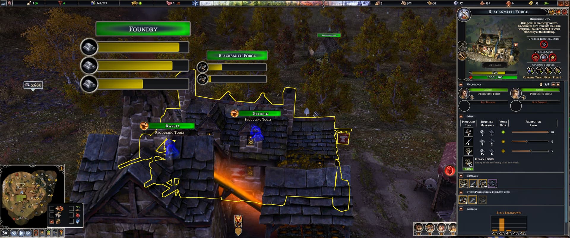 Forcing workers to wait for resources can also be problematic, as it can paralyze production. Therefore, it’s necessary to ensure sufficient resources are always available in the warehouse - manually halting production to build up sufficient stockpiles and ensuring the flow of iron and coal to cover the blacksmith’s consumption.
