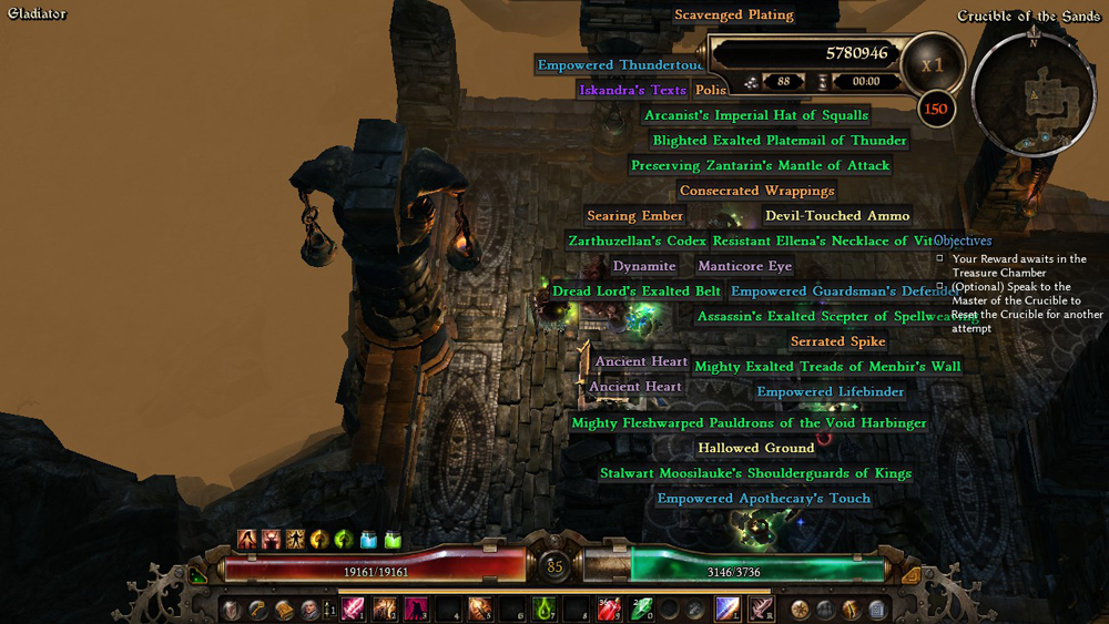 With these 3 prerequisite items and no other items, that is almost naked, I can get 70K ticks with the same character. It is surely enough to complete main campaign if equipped with proper resists and perhaps even do challenger. If I add Lapis Mantichora and emp. Bloodreaper’s mark, I can get above 100K.