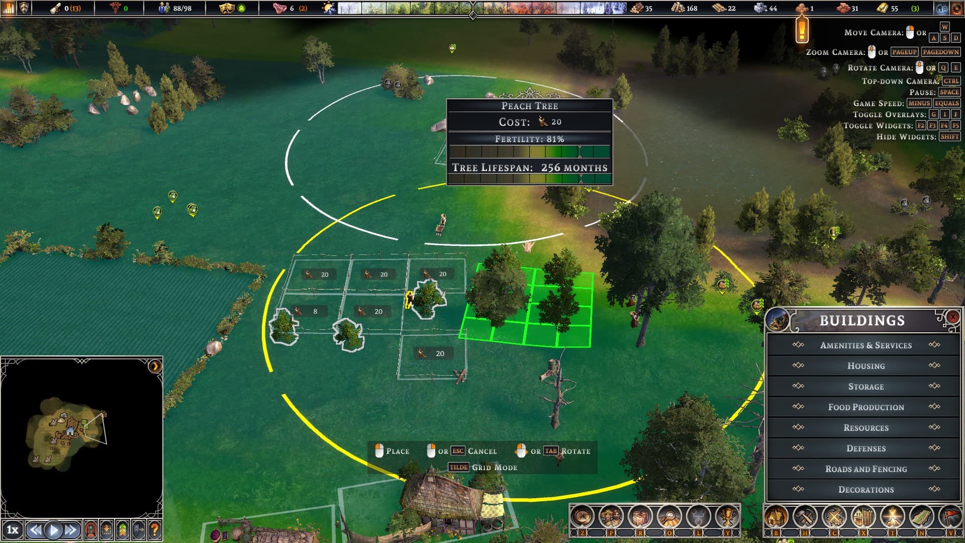 I’m not sure what/if I did something to cause this, but after building the arborist, i was initially able to place some fruit trees not aligned to the grid, but after clicking out of the menu to move another building out of the way, fruit trees wont rotate in gridless or grid mode. As far as I can tell its only fruit trees that stopped rotating.