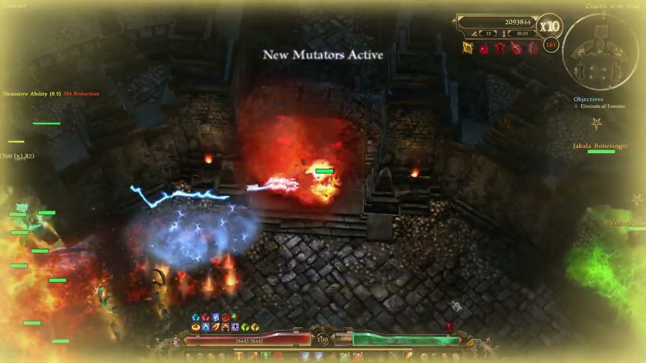 In boss rooms, feel free to pull as many as you like. Same deal, tag aether corruption while you get everyone into a group hug, mirror+ascension, and spin spin spin. You’ll notice in video below the only close call was taking a Benji + Bollag double fist of doom. If you want absolute safety just pull 2 I spose, no combo will threaten you. In other testing I pulled 2x Fabius + Iron Maiden and no issues were encountered. Uhh, buff DA or something.