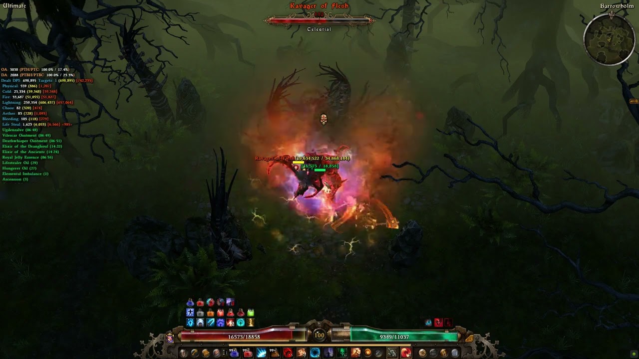 You can use 3x Skyshard augments in jewelry if you really want, it’ll improve single target kill speed a bit, but the extra HP and a bit more DA is probably more sane here (if you ask @mad_lee ). I settled on 1 skyshard 2 Ateph’s promise, I saw a relatively big Ravager kill time drop losing all 3 (Ravager has higher than sane OA requirements). You’ll have plenty of OA to keep Hand of Ultos and Elemental Imbalance proccing. In the posted videos I’m still using 3x Skyshard and ~2050 DA.