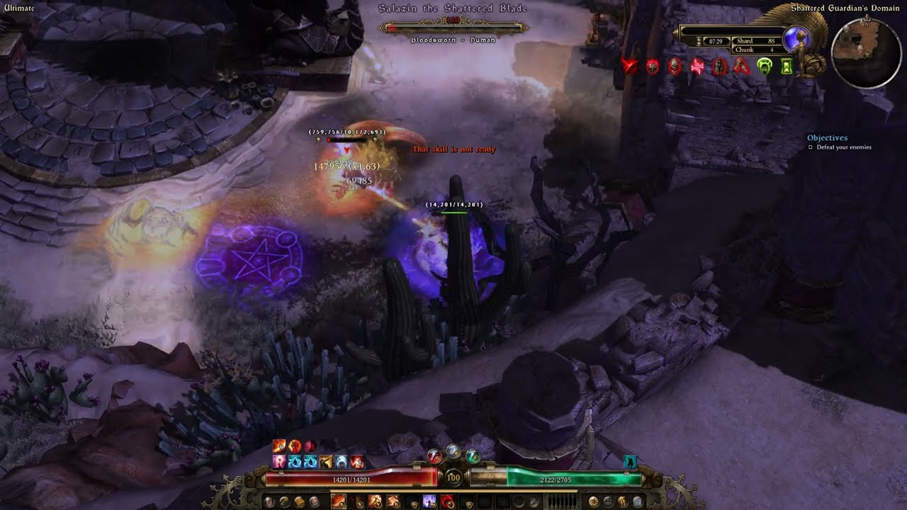 Ulzaad’s Decree: attached to Doomforce, it’s a controllable buff to get through the tough parts of fights. Amazingly, I forgot to have the spell bound to a button when I cleared SR85. So this build is stronger than in the video.