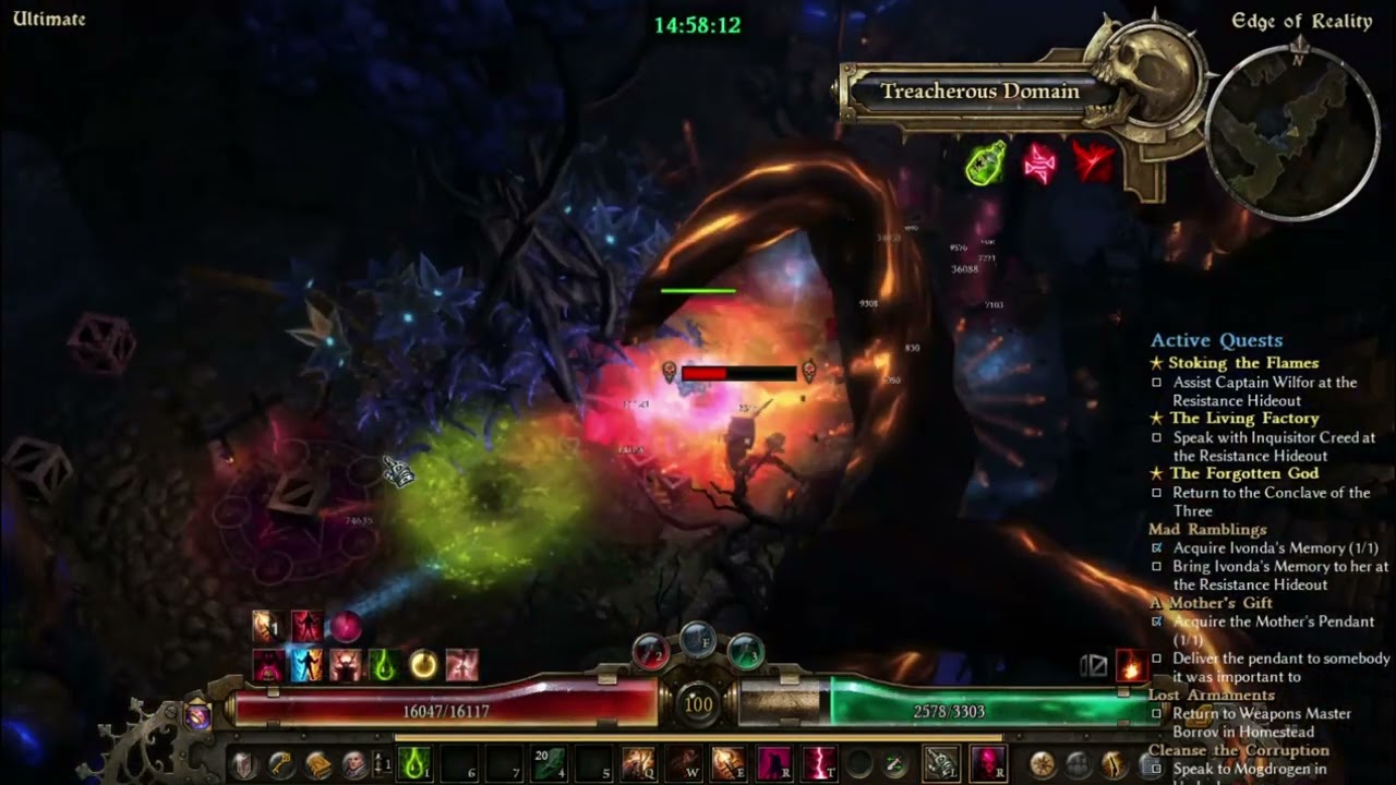 The idea is simply casting Curse of Frailty, Pox and Devouring Swarm and sit around your Wendigo Totem while the damage over time depletes the health from enemies and the procs just fly around. Primarily, we use Twin Fangs and the Eldritch Pact relic for the piercing projectiles while Sigils of Comsumption, Rend and Will of Ratosh further weakens them. And enemies get punished when hitting us with Doom Bolts, Kilrian’s Flame and Shattering Force. Toxic Gas Cloud helps with fumble/impaired aim and the Black Star (fully converted to vitality) applies the flat RR. Finally, the star of the show, the Mythical Death’s Reach, adds massive amounts of extra damage and RR to Bloody Pox and Devouring Swarm and also has its own proc, Wave of Souls, which triggers frequently. When attacking, we cast our own Doom Bolt and leap at enemies with Upon Rylok Wings (fully converted).