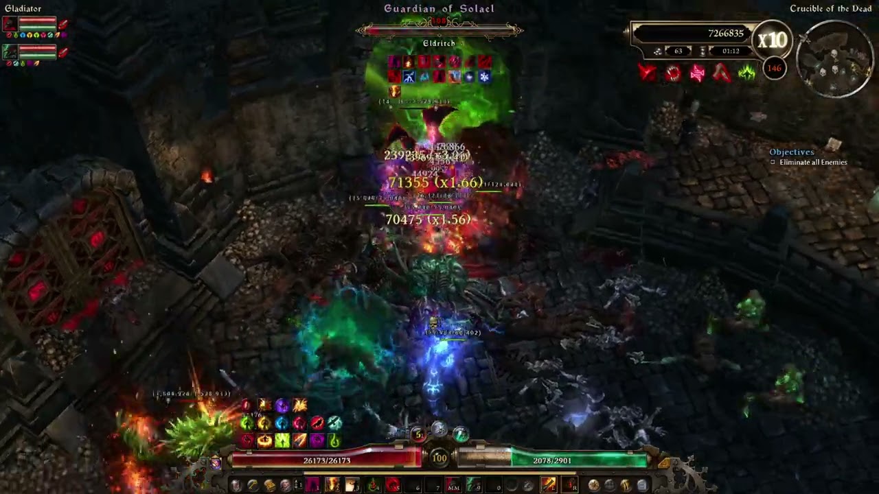 This is a dual wield melee hybrid build, who can leap into the fray to attack alongside his pets. Player crits are between 50k-150k per sword (so potential ~100k-300k crits per attack), with 3.21 attacks per second with all buffs up. While the player’s damage isn’t mindblowing by any means on it’s own, the damage from the build is still significant enough as complementary damage to that of the pets.