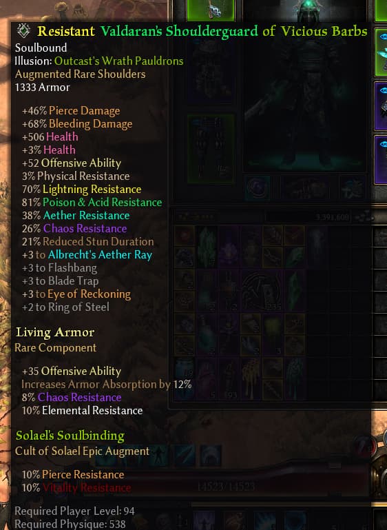 What you’re looking for with the Bladearm is the “of Shattered Reality” suffix which provides an incredible +5 to Fabric of Reality alongside the other incredible buffs to Reckless Power and the % rr of the granted skill, as this class combo doesn’t provide any native resist reduction. You can still reach a respectable -74 aether rr (disregarding the 18% from the granted skill).