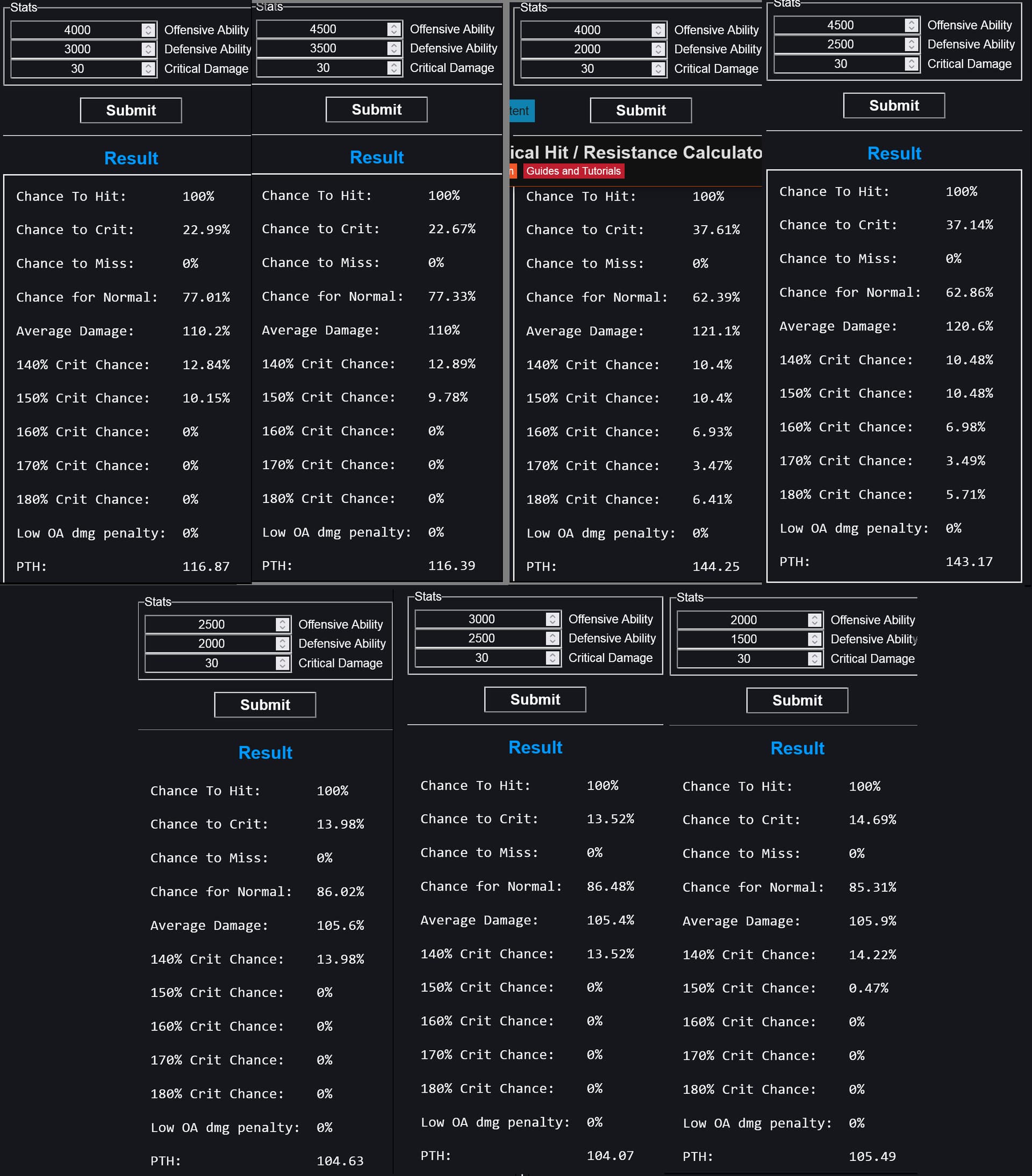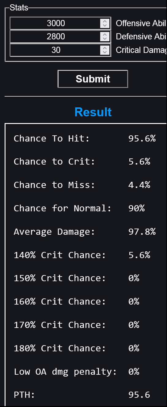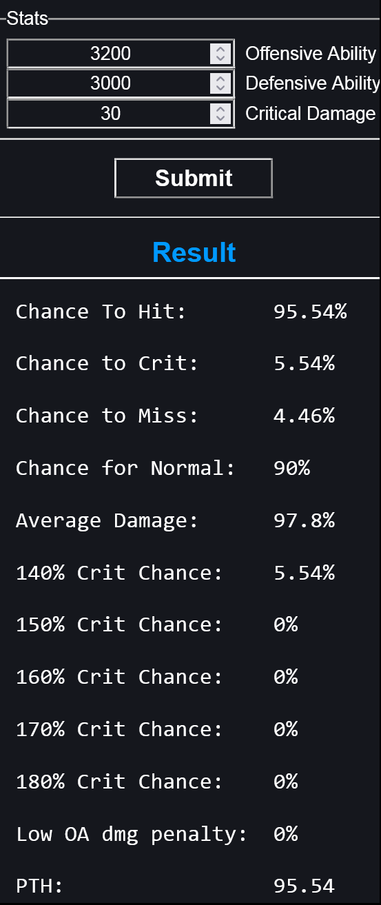 Probability To Hit (PTH) = ((((Attacker’s OA / ((Defender’s DA / 3.5) + Attacker’s OA)) * 300) * 0.3) + (((((Attacker’s OA * 3.25) + 10000) – (Defender’s DA * 3.25)) / 100) * 0.7)) – 50