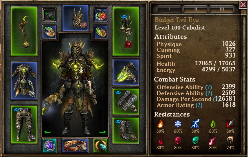 This build is very SSF/beginner friendly since there are so many DEE related items in the game. You could probably make an entirely different second budget build besides the one provided. I decided on this one to go for a blue set build. This build will show low OA, but you will be reducing enemy DA by ~450 using the blightfiend aura and curse of frailty so it works fine.