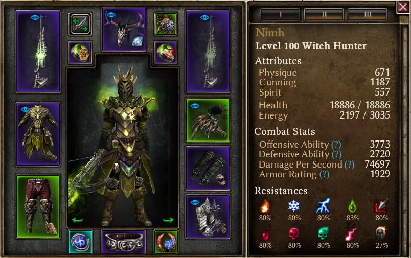 Even with only 18k HP, you’re fairly tanky with Possession, full armor absorb, 27% phys res, dodge/deflect, confuse, fumble, slowed enemies, etc., but much of your tankiness also comes from leech so keep chuckin’ them poison blades. You do actually have decent regen as well, but not quite Shaman levels.