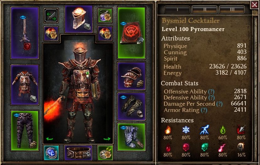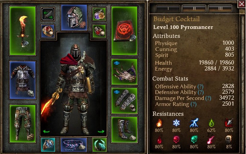 This is Hybrid Pet build for using Blackwater Cocktail spam as main attack with Hellhound and Stormraven pets. Damage type is fire for both player and pets. The endgame version of the build will wear the full Infernal Knight legendary set.