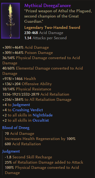 A lot to unpack here. Acid Judgment looks pretty cool but that’s all I can say for it. Damage is way too low. For supporting gear, 4 piece Perdition gives the most flat retal but attack speed is abysmal. On the defensive side I had to dedicate half of the devotions to survivability just so the character wouldn’t feel like a wet noodle. Despite the health regen mod to blood of dreeg it still feels insufficient.