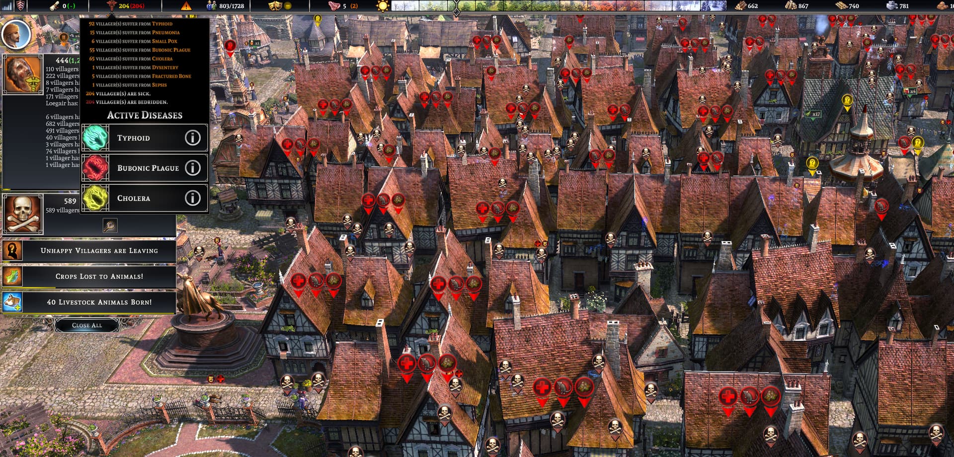 Bubonic plague seems to have a high spread chance, so once some folk gets it, the spread is very fast.