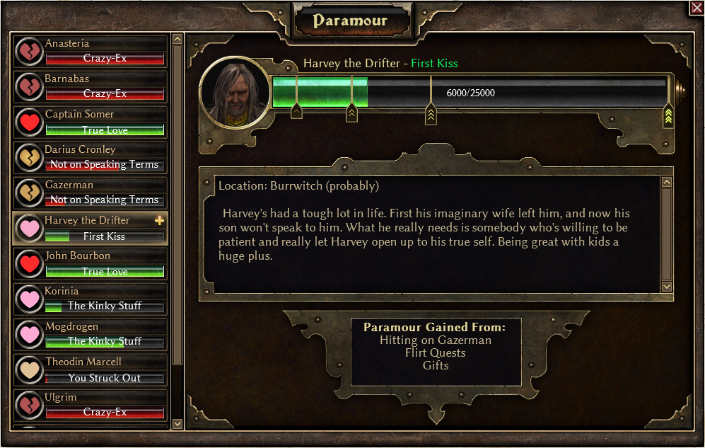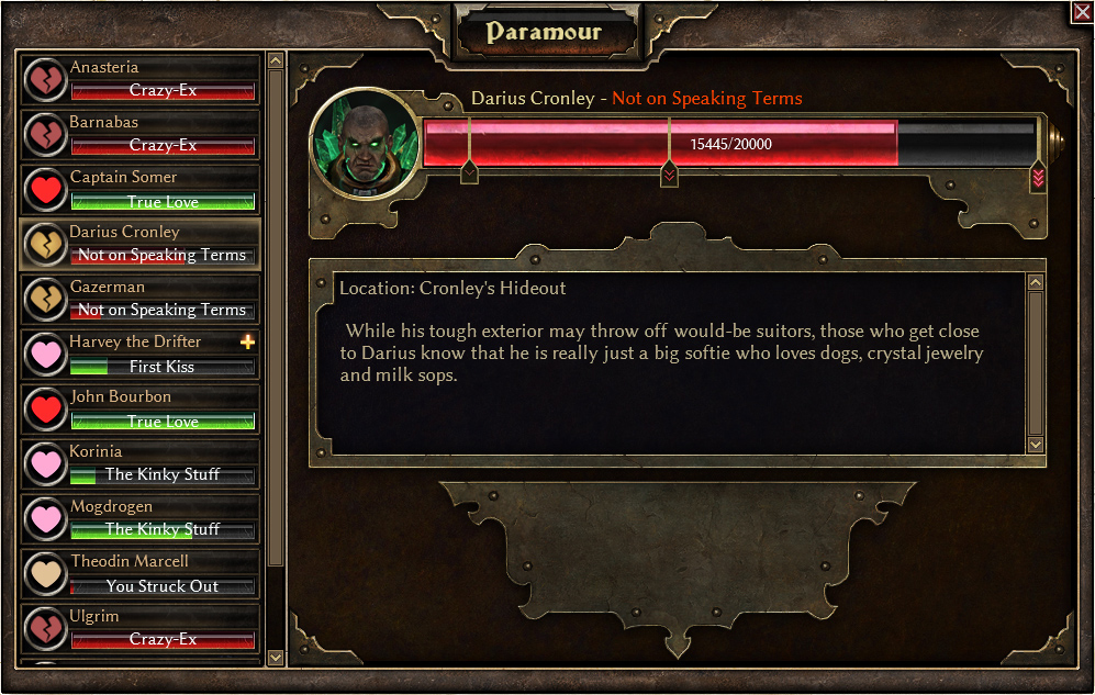 Just as each relationship in life is different, every character in Grim Dawn will feature unique challenges that you will have to overcome before breaking through their tough outer shell. Cairn is a brutal place, and it’s only natural that not everyone will welcome you with open arms. But with enough loot drops and a few quests, you may just find yourself moving on to the next Paramour tier!