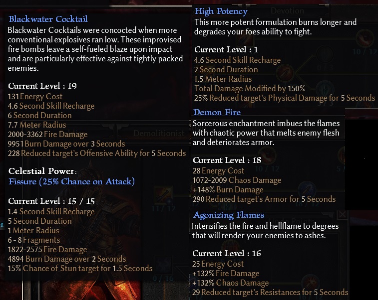 Usual rotation at lvl60 ish is > flashbang + backwater cocktail way ahead of me or into a door/whatever > fire strike + fireball > canister bomb (stun) > fs + fb > stun jack (stun) + hellfire mines at my feet > fs + fb > everything dead > if not, Hellhound sacrifice + repeat. Half the legendaries I find are guns/rifle so I’m bit overpowered versus the content, it’s difficult to get a good feel for it, but mobs die in 1-2 seconds, and bosses die in 4-ish.