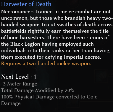 So if you were a cold necro, trying to level as your end build which uses a maxed boneharvest on 2h (because it’s decent dmg without modifiers), then the conversion helps that little extra bit… also even if you’re maining something else, it’s a hard hitting 2h filler you’re not guaranteed to fully convert on the existing cold items “until end”…
