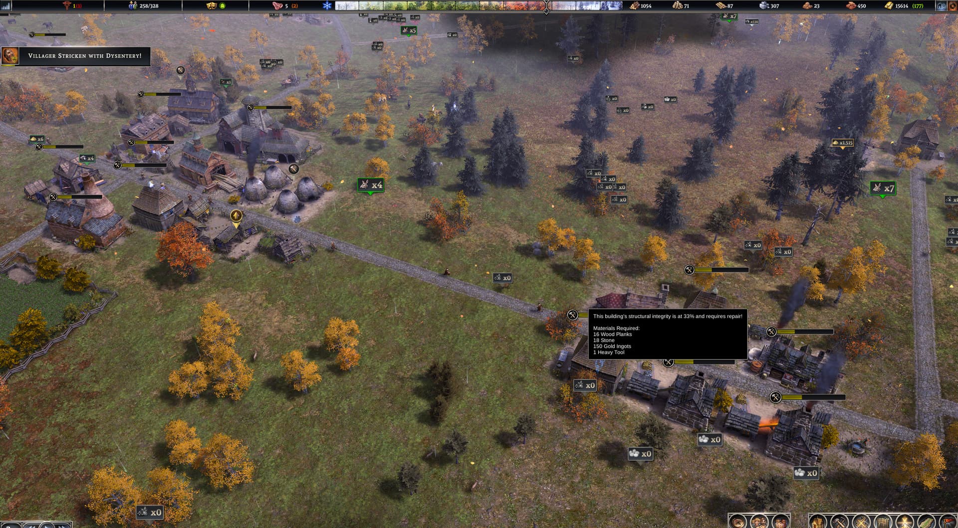 It is happening to me as we speak. Only I didn’t build all of the decaying buildings at the same time nor do I lack materials or the labor to repair them. I have thousands of resources gathering dust waiting to be used but my people just walk right by decaying buildings.