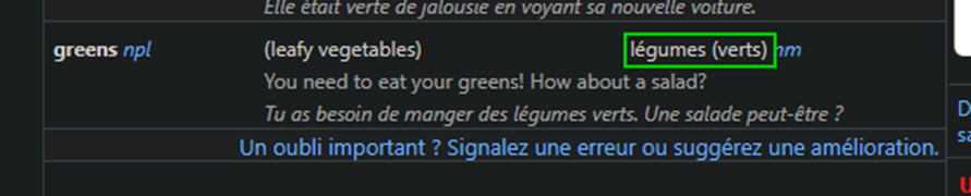 Singular form in French is a bit weird, you do not eat only 1 vegetable. (greens in used in EN version, not vegetable)