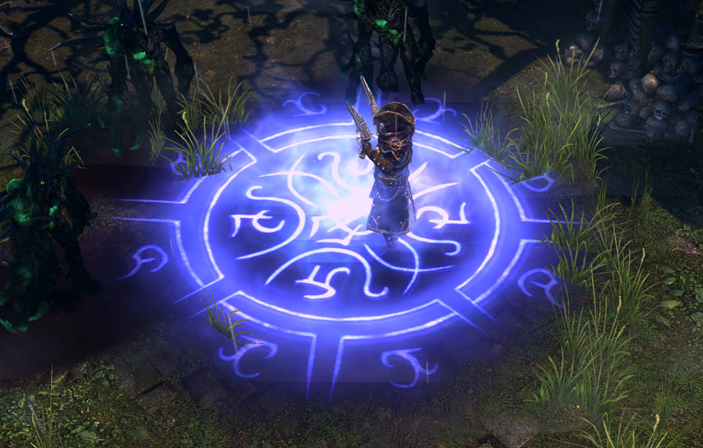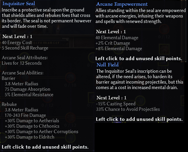 This protective symbol guards you and your allies against harm, but also harms any enemy that steps within it. The modifier for this ability empowers allies standing within it with offensive Elemental potential. The Transmuter offers additional protection against ranged attacks at the cost of spellcasting focus. The seal is a powerful spell to use in the thick of combat, or to plant yourself at a distance and take out anyone that dares approach.