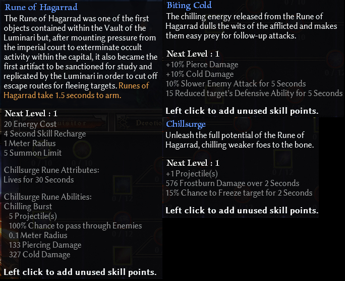 The Rune of Hagarrad is a chilling addition to the Luminari arsenal, piercing unfortunate foes with shards of solid ice when triggered by an approaching foe. The modifiers for this ability enhance its chilling potential and increase the number of shards emitted upon activating.