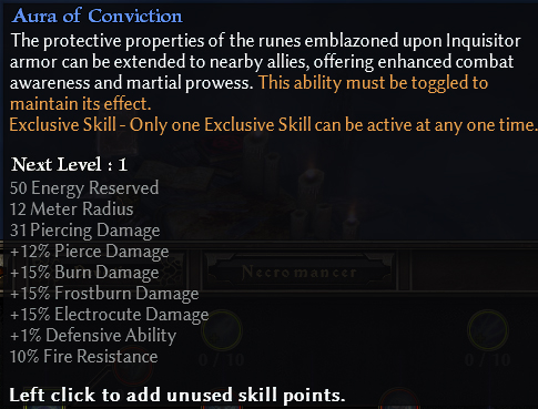 This exclusive skill is the culmination of inquisitor training and embodies not only their lethal potential but also their exceptional leadership skills. Unlike most exclusive skills, the Aura of Conviction also benefits nearby allies.