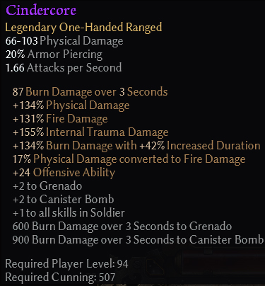 Note: Item stats may change during active development. Values on skill procs are scaled by player attributes.