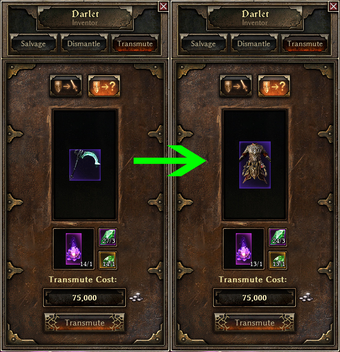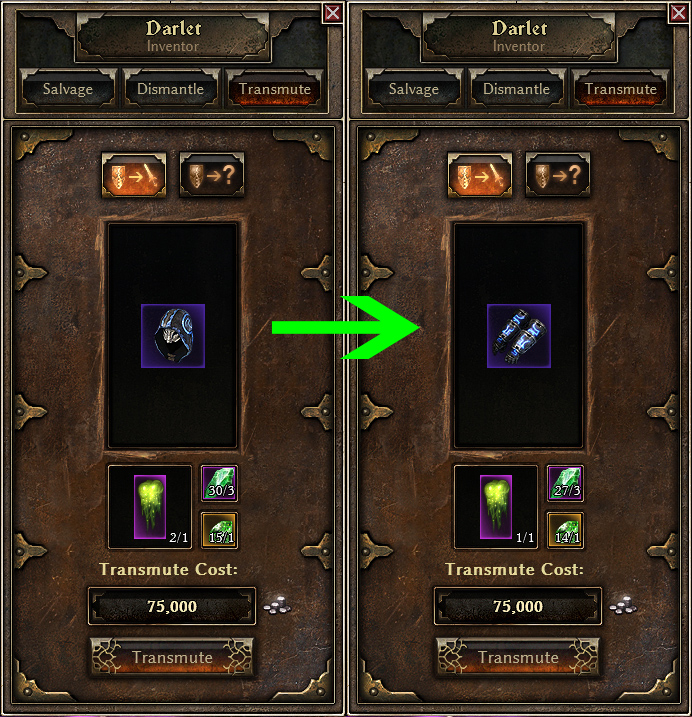 Transmutation has been created specifically to aid you in completing item sets. Whenever you end up with a duplicate set piece, you can simply bring it over to your neighborhood Inventor. There you will have two options: Same Set and Random Set.