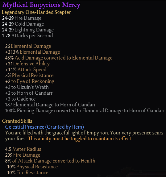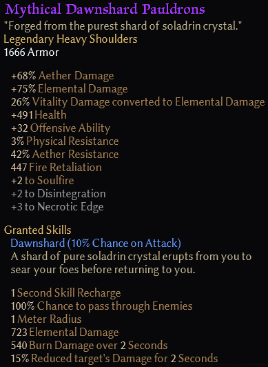 Nice work. The Dawnshard Bulwark illusion will go great with the pauldrons and mace, although I miss the point in adding the acid to elemental conversion on Empyrion’s Mercy being it a Inquisitor/Soldier/Demolitionist/Oathbreaker supported mastery weapon~