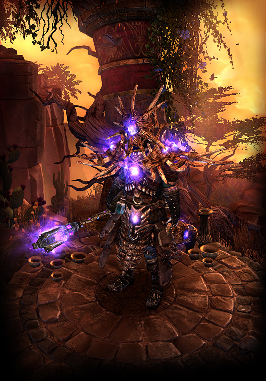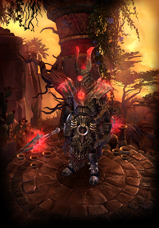 Disease and pustules embody this rotting armor. Charge into battle with Vire’s Might and unleash your vile powers through a Vitality Primal Strike. Finish off any stragglers with an empowered Dreeg’s Evil Eye.