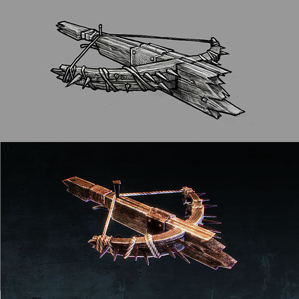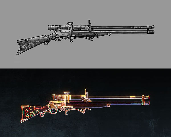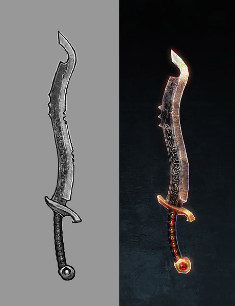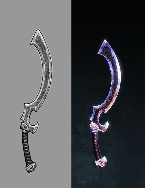 Once the concept has been approved, the item is modeled and textured. The modeling step attempts to replicate the concept art, but sometimes changes are necessary to avoid clipping into the character model or to enhance details that would otherwise not show up very clearly in the game engine.