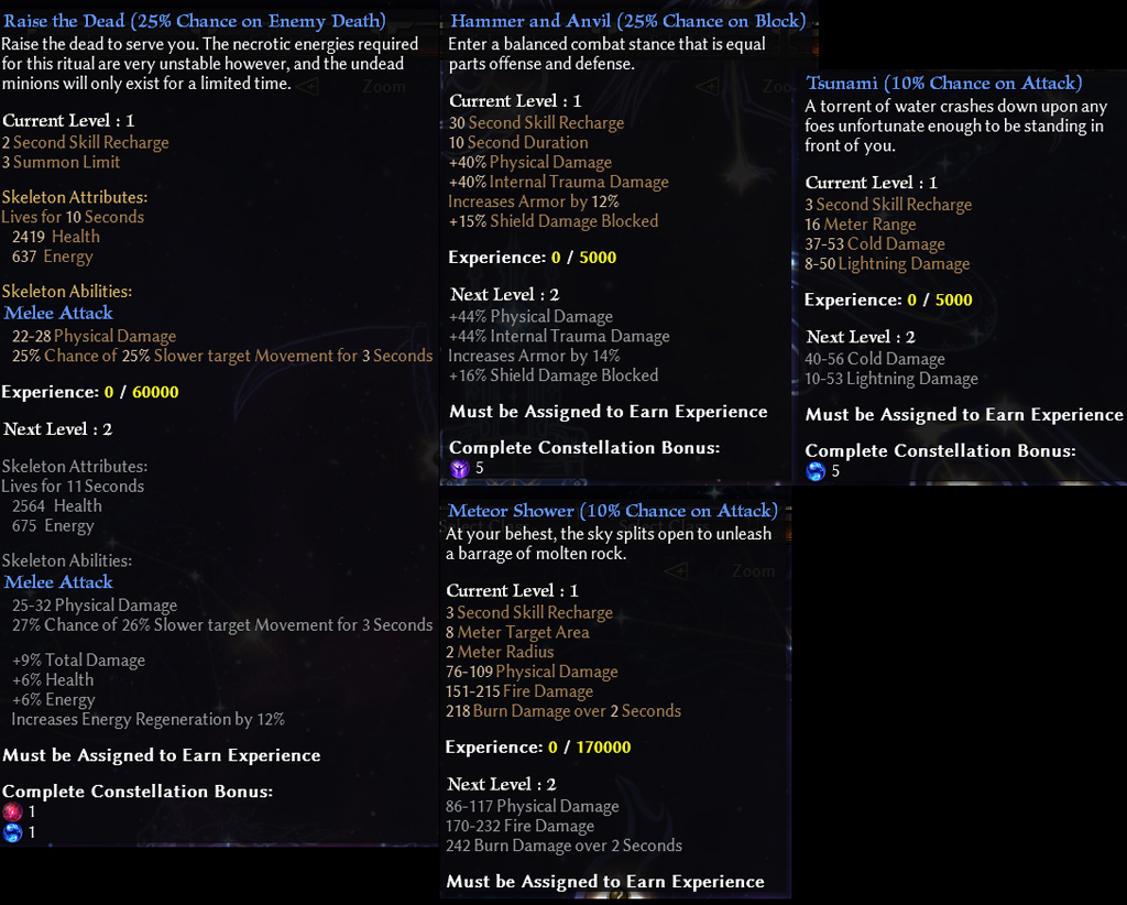 When you unlock these bonuses, you will earn access to what we are calling Secondary Effects. Secondary Effects are unique skills which will have a chance to trigger off of the spells and abilities within your Masteries. There are a total of 43 different Secondary Effects dotting the night sky with their golden light. What mastery skills they can be assigned to varies from Effect to Effect, but they are very flexible. Take a look below for just a few examples: