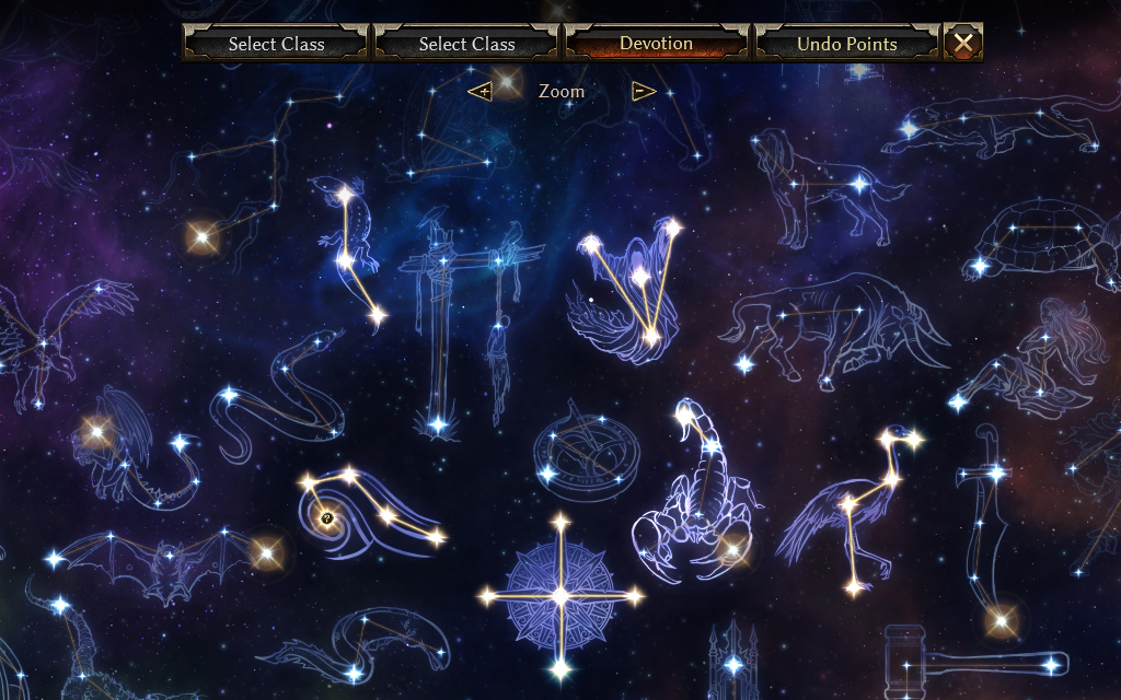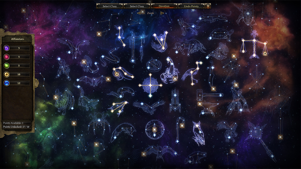There is a total of 79 Constellations, each with 3-8 stars for a total of 425. With 50 Devotion points, you can fill in about 12% of this massive celestial map. But you cannot simply pick and choose the stars you want. The Constellations serve a greater purpose. You see, each Constellation is aligned to a combination of Affinities: Ascendant, Chaos, Eldritch, Order and Primordial. This means that every Devotion point will be critical to your ultimate build.