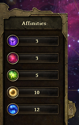 The Constellations available early on have few or no Affinity requirements, but bestow upon you significant Affinity bonuses when completely filled. The most powerful Constellations do not grant any Affinity at all, but instead have high requirements, which you must meet through other Constellations. Affinity is not spent to unlock Constellations. Instead, your totals must meet or exceed the requirements. This makes it possible to unlock several high-end Constellations, though that may take immense dedication to specific Affinities.