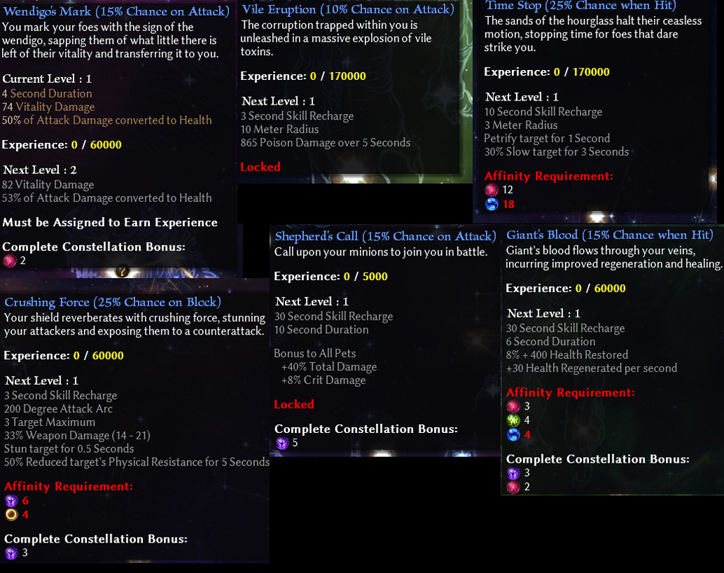 With recent changes to Devotion, your list of valid skills will also include any skills you earn from your equipment and components. Should you switch out your equipment, the skill assignment will remain, but the secondary effect will no longer be active or gain experience. This opens up exciting new opportunities for equipment-based builds.
