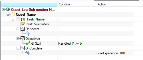 Quests in Grim Dawn are broken down into Tasks, which then have their own sets of Objectives. This flexible setup allows you to create branching situations in quests where one task can lead to several different tasks depending on resolution.