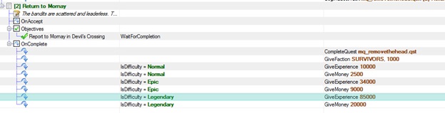 In addition, you can execute Actions (give skill points/attribute points/iron bits, give/take items, give Tokens, etc.) at the beginning of each task, upon completion of individual objectives and at the end of each task. Action execution can be further refined with Conditions (does the player have an item? A Token? Has killed X of a monster? Etc.).