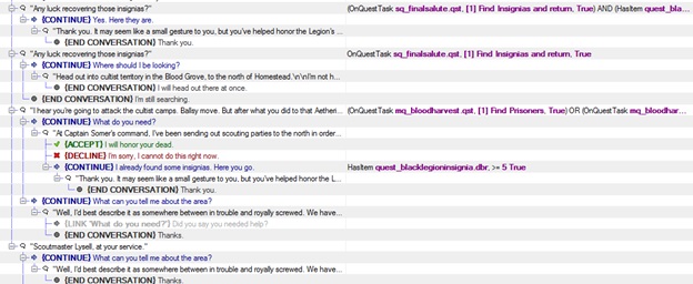 For example, the Paying Tribute quest in Old Arkovia has 4 possible endings and required 6 quest Tasks. Which Task was started was largely controlled by what conversation choices the player made. This all intertwined further with Lua scripts to create the different endings. Including the quite fatal one with the entire village destroyed.