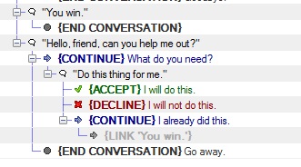 As with the Quest Editor, you have extensive control over what dialogues occur and what happens next with the careful use of Conditions and Actions. Has the player done a particular quest? Then offer them the next. Has the player already slain a monster for a quest? Rather than offering them the quest, let them skip right to the turn-in step.