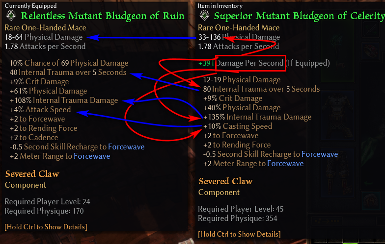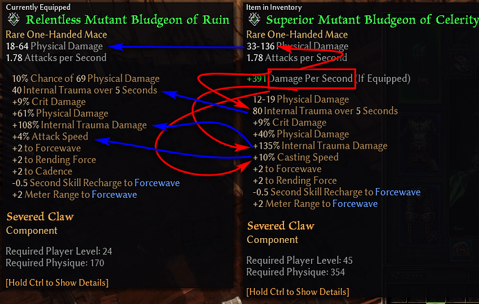 https://imgur.com/a/GdvDzD8 These are the two maces, both have +2 to forcewave, the same augment, one is 33-136 physical damage reads out +391 DPS compared to what I was using, and when I equip it my Weapon Damage read out increases sizeably. Yet this 18-64 physical damage still shows a higher Forcewave Damage output almost all the other stats are the same too. I am very confused about this. Unless there are hidden modifiers I cannot even conceive what could cause this besides an error in the read out which I will go test to see if I get higher damage on attacks with the new mace.
