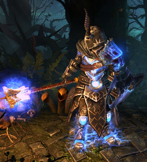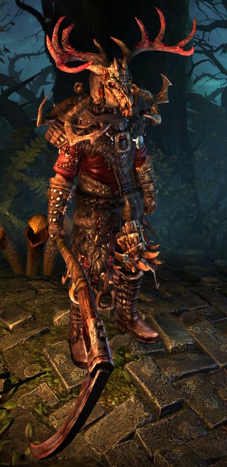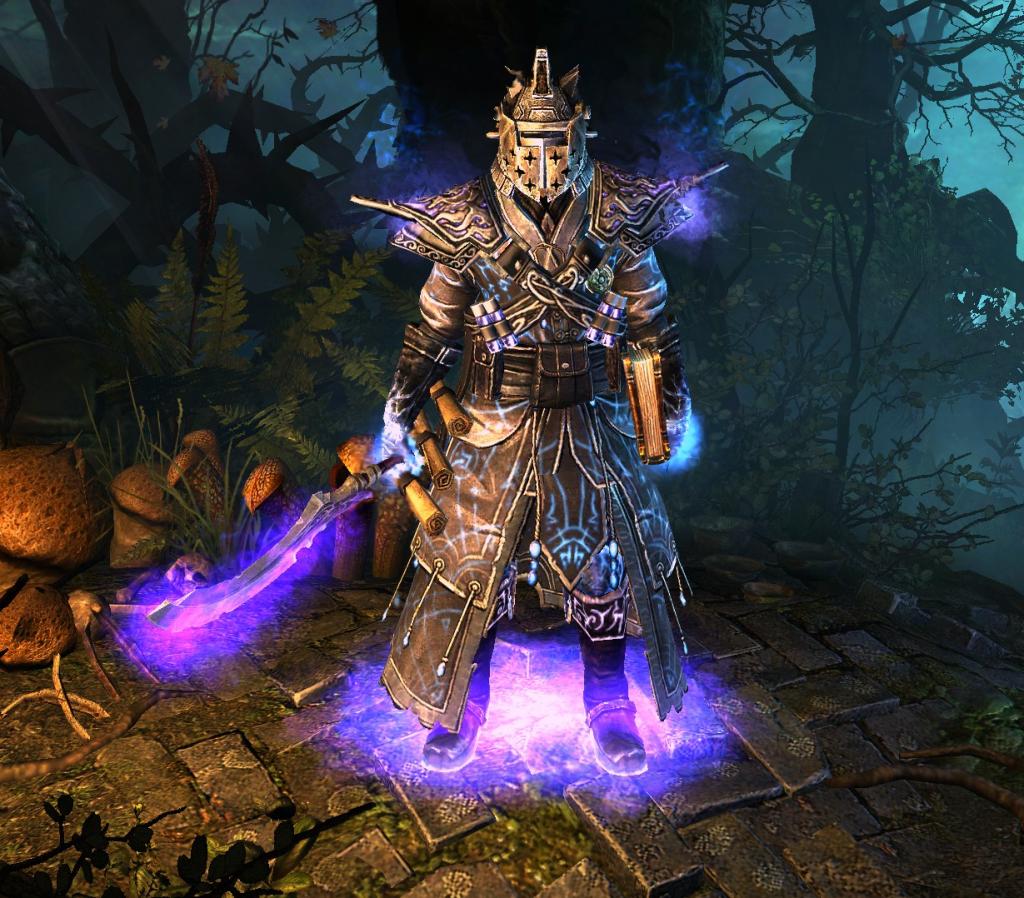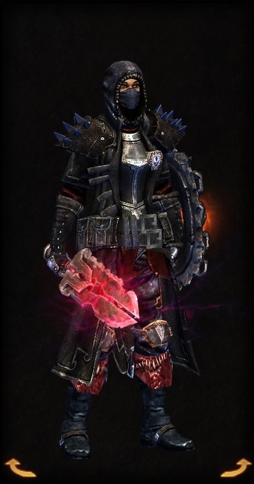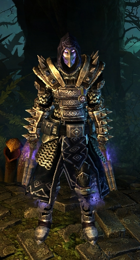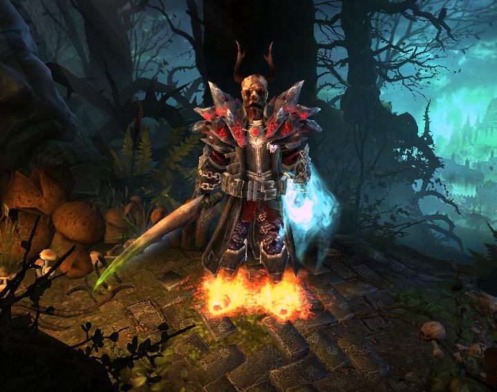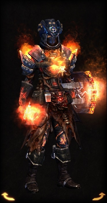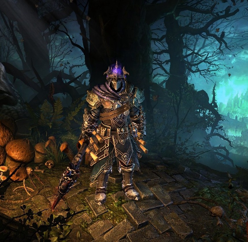 Wearing Malmouth gear, blackflame head piece, voidsteel gauntlets and Fang of Chtons. He is a beast of man…a true chaotic witch hunter.