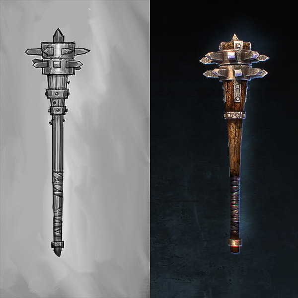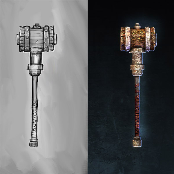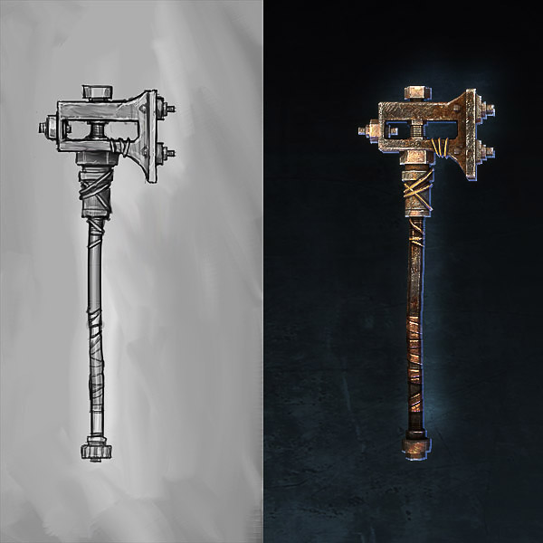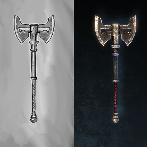 Below is a small sampling of a few 2-handers from the 3 melee types (sword, axe and hammer). Most are lower level, but I included a couple higher tiers to show some progression. I’ve also included the concept with each item so you can see a little before and after action. Please take care not to cut yourself while handling the images, some of the blades probably have a decent amount of tetanus (or something worse).