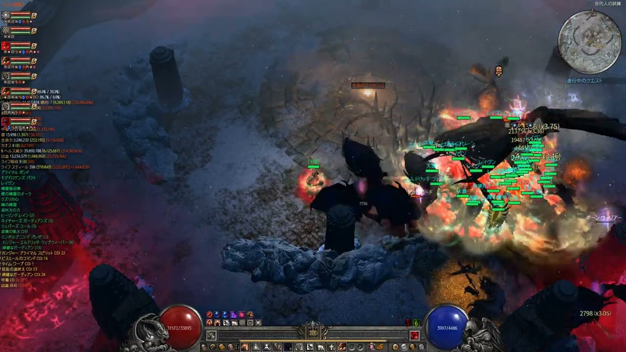 このヘルス減少攻撃は、初回に敵のヘルスを一定の%で減らすので、ヘルスの高いボスクラスの敵だと高いDPSが出やすく、「古代人の試練」のようにこのボスが複数出てくる場面だと、とんでもない数値が出るという訳です。そして、これは攻撃ソースの数が多いほど効果を発揮するのでペットの数が多いほど効果が期待できるということになると思います。ただし、一瞬で敵のヘルスの2/3程度を減らせるとしても残りは通常の属性ダメージによる攻撃が必要なのであまり特化しすぎても結局のところ倒す時間が速くならないというバランスの難しさもあると思います。ちなみに、このビルドにおいては、セットボーナスとレリックの効果が大きい感じで、コンポーネントの「バールーン」なども使えばさらに特化できると思います。