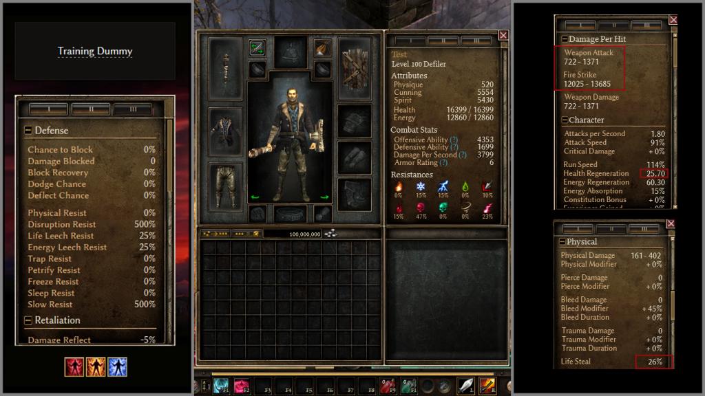 Here you can see the stats, average damage, life leech, and the dummy life leech res :