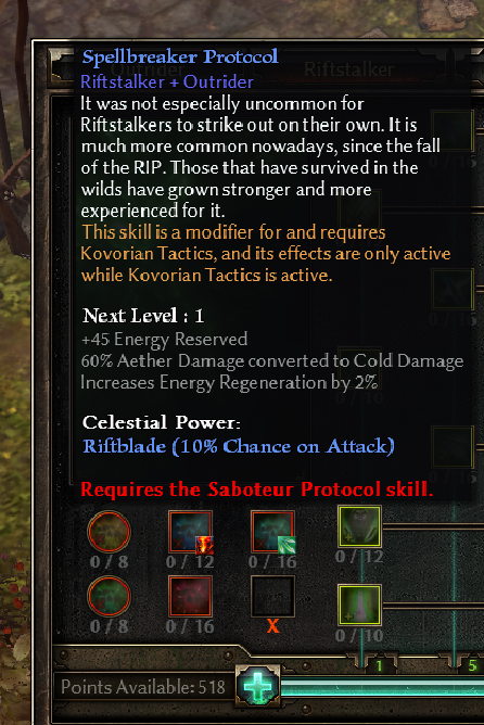 [li]Spellbreaker Protocol - Modifier for Korvoranian Tactics. Converts Aether -> Cold, gives some energy regen. On attack, chance to cast Riftblades. [/li]