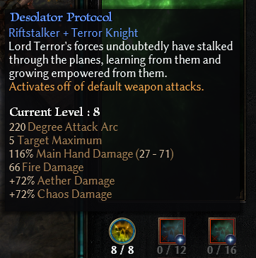 [li]Combat Art - Desolators - General buff with loads of +% Armor Piercing (for Phys->Pierce conversion; if you have even 1% Armor Piercing on a weapon you won’t do any Physical Damage) and Vitality -> Chaos conversion. Features an on-hit proc that fires out Chaos/Fire projectiles. Compared to the other dualclass skills in Terror Knight, this one doesn’t really have as much ‘flair’ in terms of stat bloat, but I like the way in performs in game, so I’m not expecting to change it much.[/li]