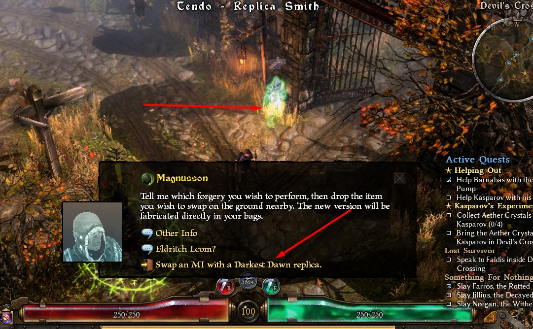 This NPC can exchange MI (monster infrequent items) for Replica MI’s, while retaining all affixes. Simply click the swap dialogue option and then drop MI item on the ground nearby NPC, it will be converted and added back to your inventory.