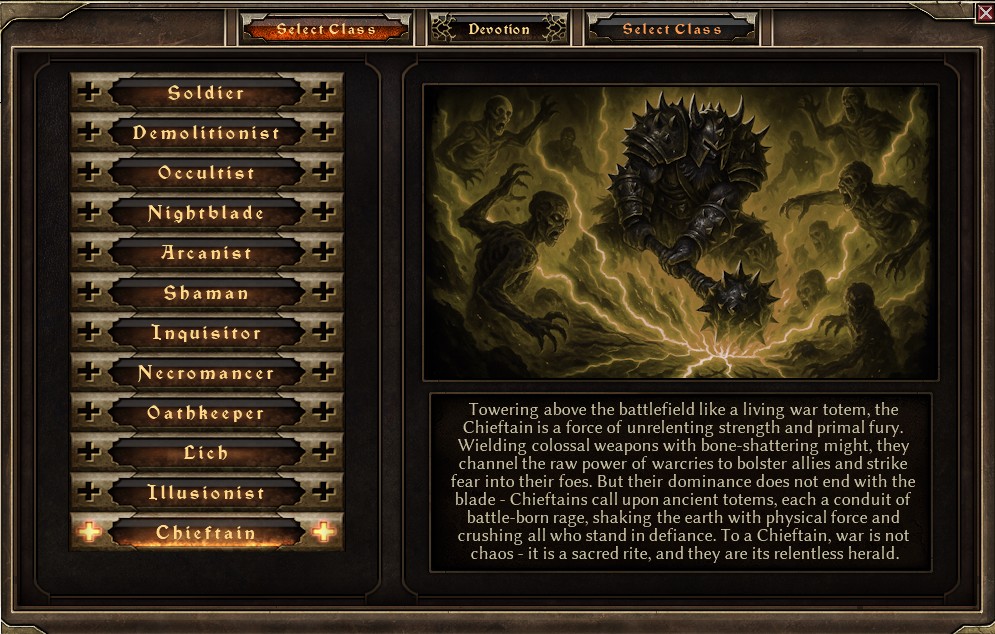 Chieftain is a towering brute, focusing on warcries, totems and powerful melee attacks.