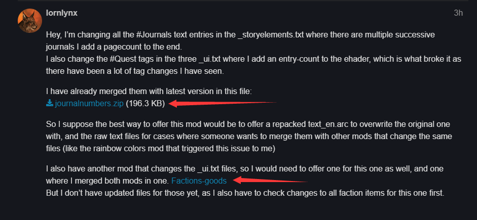 If the “_storyelements” text-files get overwritten, just open them in a text-editor like Notepad and search for the “#Journals” line in the files from me, and copy all the lines up until the “#Guards” line. Replace the same lines in the files of the other mod you have already installed with these.