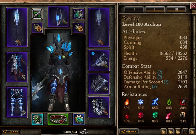 Been here awhile, but only now finally found the spare time to post a couple of my favorite builds. I’ve really liked the idea of player-scaled pets ever since I came across this one by @Contragor. And then I found out Wind Devils are finally permanent (never thought that would happen! Thanks Crate), and here is the result. Does SR 30-31 easily; SR 36 is fine as long as you’re careful, but I’ve never managed SR 38 (somehow Moosil always shows up, and I just can’t get past him on that level). Callagadra is notably easy. Mogdrogen is straightforward enough, though the pets get in the way. Ravager was a pain, probably because Of Souls is just bad for this build because the summons eventually make it a bullet hell to get through. Did it once and don’t care to repeat for a video.