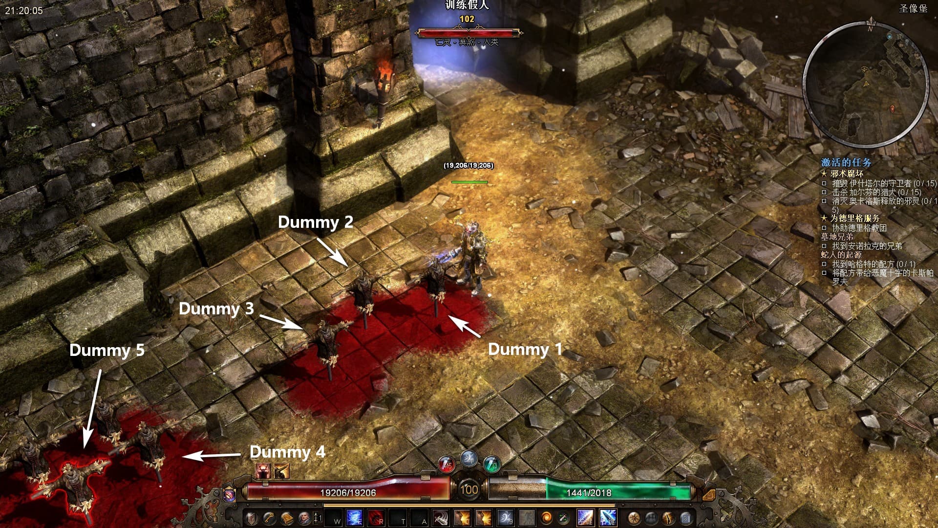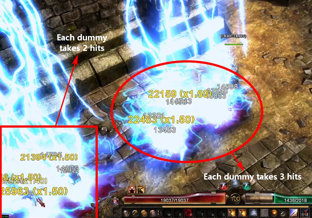 Without Blood Burst, Evil Eye has a very small explosion range. When you’re lucky, the Evil Eye can pass through 5 dummies, and trigger Vile Eruption 5 times.