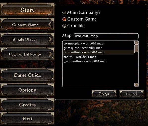 When in game, and selecting from the Custom maps menu, if you do not see āgrimarillion ~ World001.mapā then something is not right, no need to play until you see āgrimarillion ~ World001.mapā.